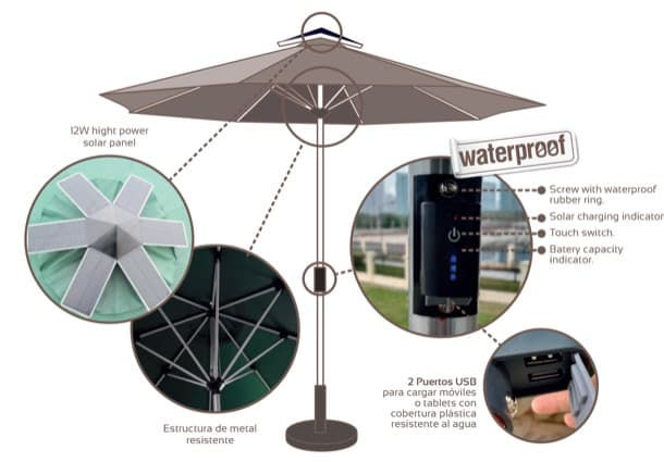 Ropa con protección uv, sombrillas fabricada con telas que protegen del sol, sombrilla solar de uso diario, sombrilla solar portable, para mesas, jardines , hoteles, parques, casas y donde la requieran en general, Con conexión, de carga energética.
